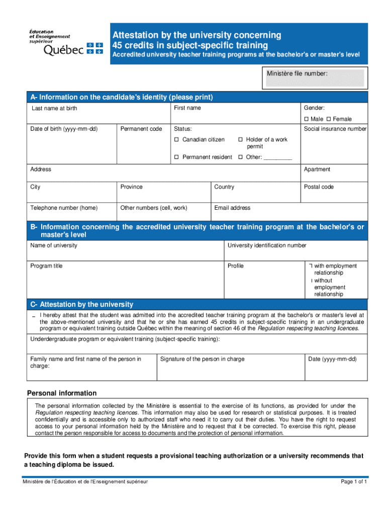 Attestation by the university concerning 45 credits in subject specific training Accredited university teacher training programs at the bachelor's or master's level Minister file number:A Information
