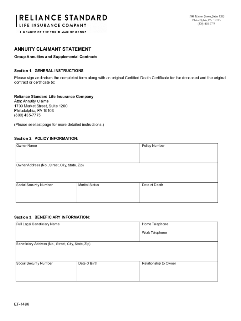 This form is typically required by individuals who are the beneficiaries or policyholders of Reliance Standard annuity products and need to initiate a claim for annuity payments.