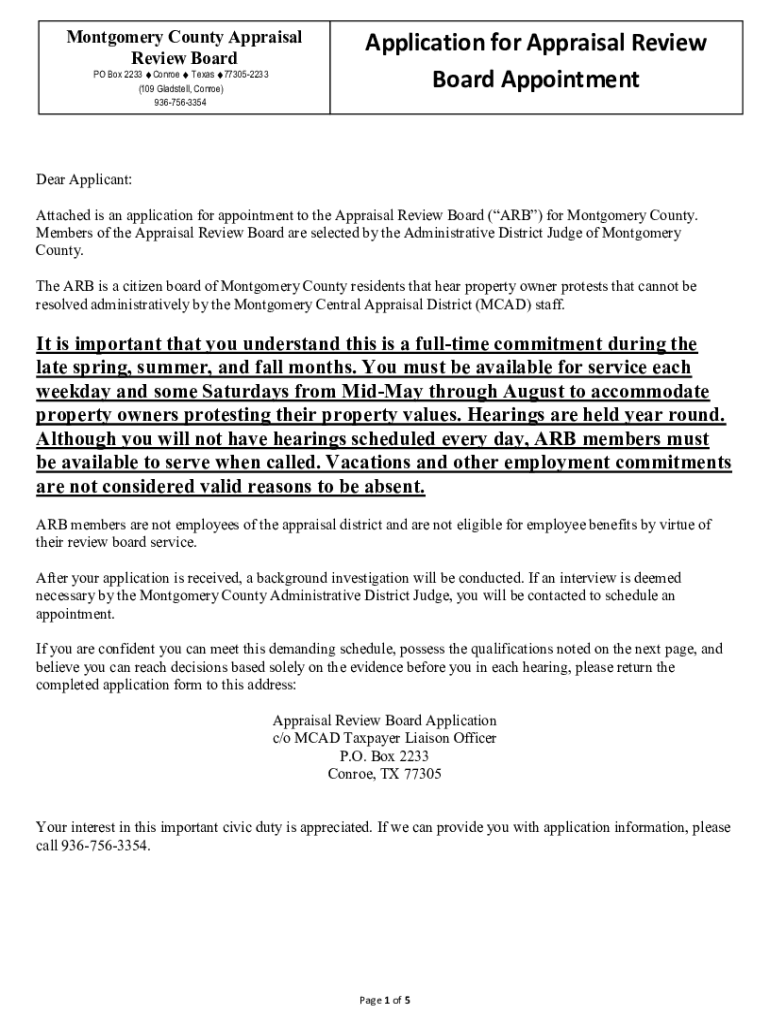 Montgomery County Appraisal Review Board PO Box 2233 Conroe Texas 773052233 (109 Glads tell, Conroe) 9367563354Application for Appraisal Review Board AppointmentDear Applicant: Attached is an application