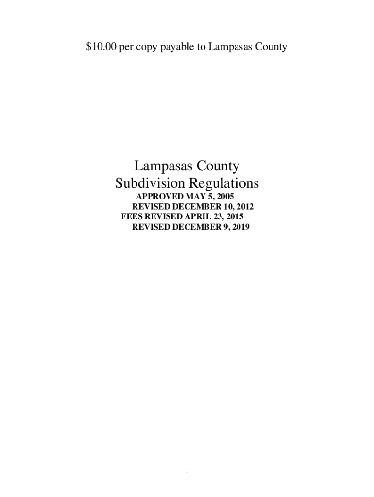 $10.00 per copy payable to Lambadas CountyLampasas County Subdivision Regulations APPROVED MAY 5, 2005, REVISED DECEMBER 10, 2012, FEES REVISED APRIL 23, 2015, REVISED DECEMBER 9, 20191TABLE OF CONTENTS