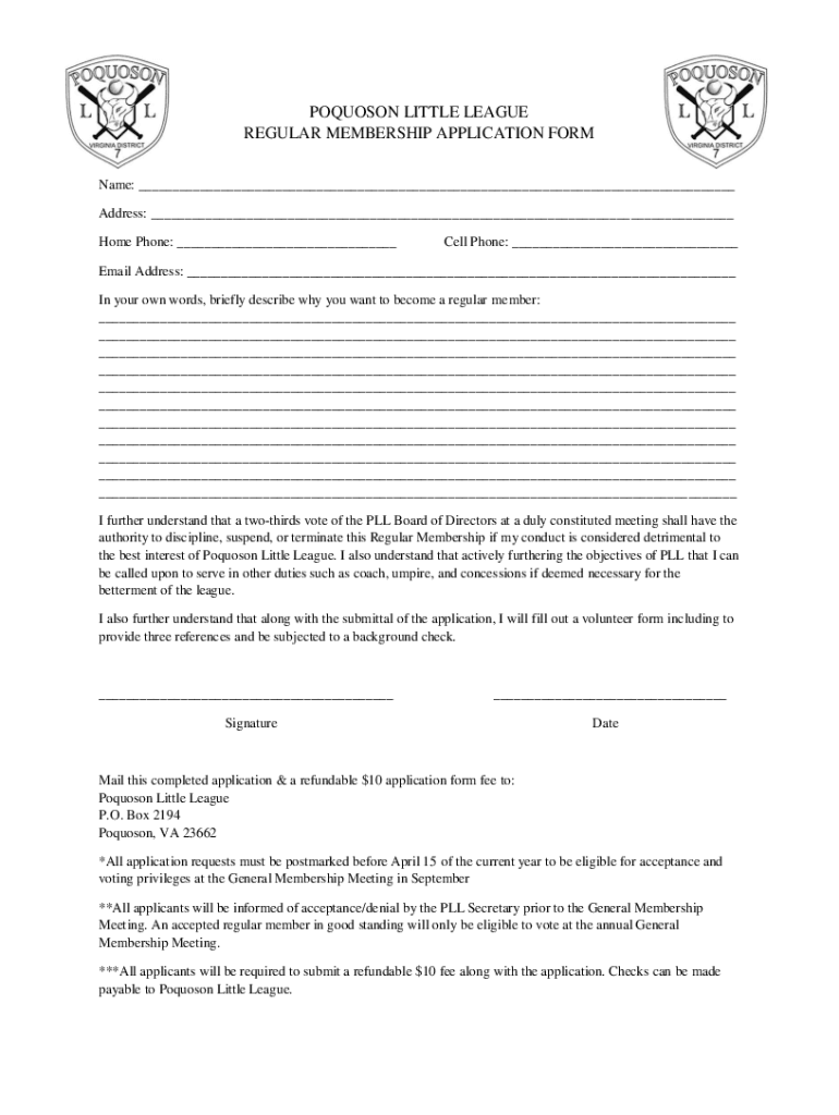 POISON LITTLE LEAGUE REGULAR MEMBERSHIP APPLICATION FORM Name: Address: Home Phone: Cell Phone: Email Address: In your own words, briefly describe why you want to become a regular member: I further