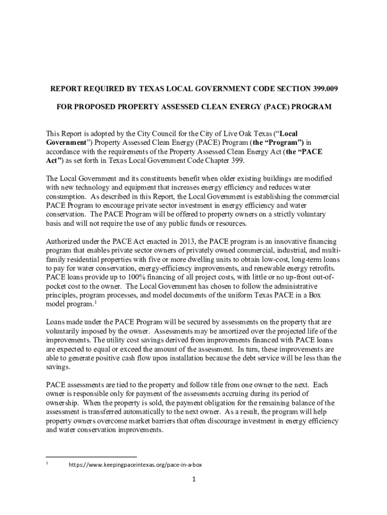 REPORT REQUIRED BY TEXAS LOCAL GOVERNMENT CODE SECTION 399.009 FOR PROPOSED PROPERTY ASSESSED CLEAN ENERGY (PACE) PROGRAM This Report is adopted by the City Council for the City of Live Oak Texas
