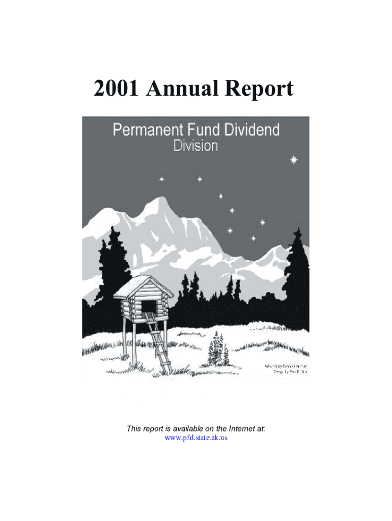 2001 Annual Reports report is available on the Internet at: www.pfd.state.ak.usDedicationThis years annual report is dedicated to the employees of the Permanent Fund Dividend Division, whose dedication