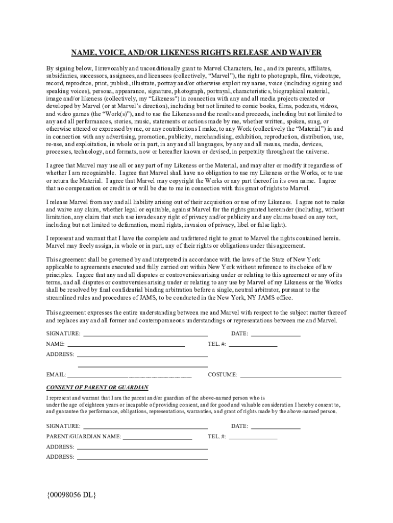 NAME, VOICE, AND/OR LIKENESS RIGHTS RELEASE AND WAIVER By signing below, I irrevocably and unconditionally grant to Marvel Characters, Inc., and its parents, affiliates, subsidiaries, successors,