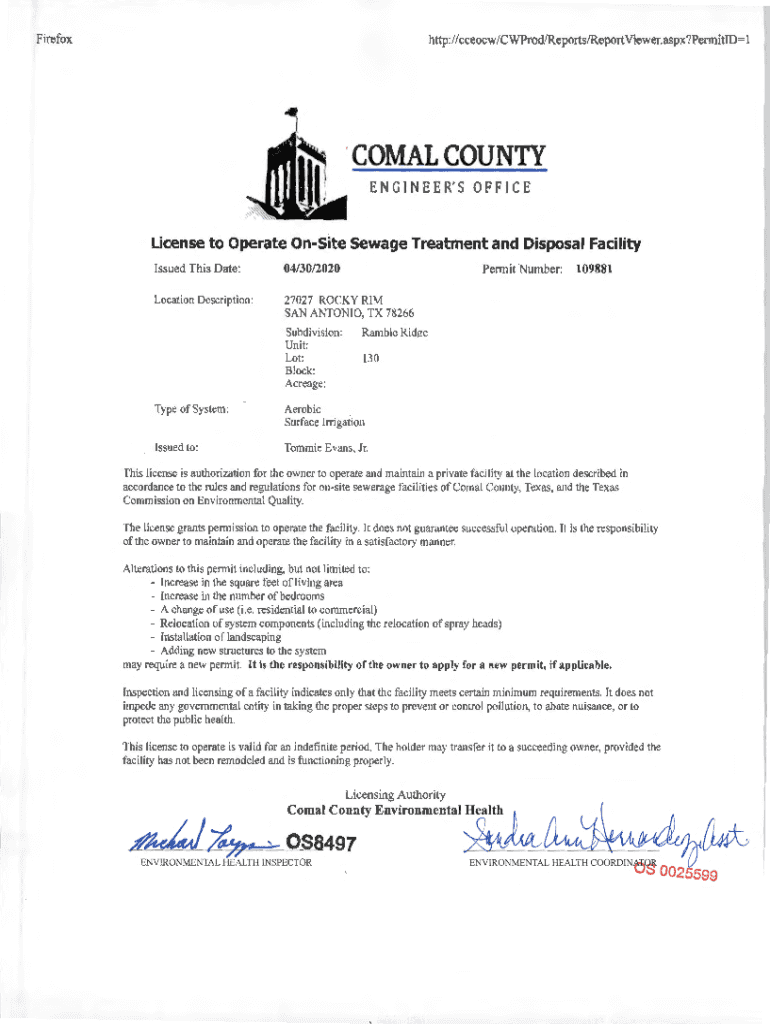 Permit of Authorization to Construct an Onsite Sewage Facility Permit Valid For One Year From Date IssuedPermit Number:109881Issued This Date:10/23/2019This permit is hereby given to:Tommie Evans,
