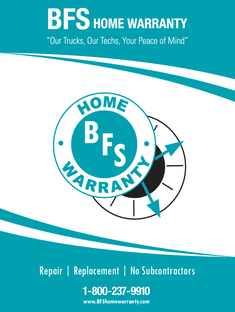 Repair Replacement No Subcontractors 18002379910 www.BFShomewarranty.comSELLERS COVERAGE BFS Sellers Coverage Protecting the HOME Protecting the BUDGET Protecting the PALETTE PERKS Pay nothing now