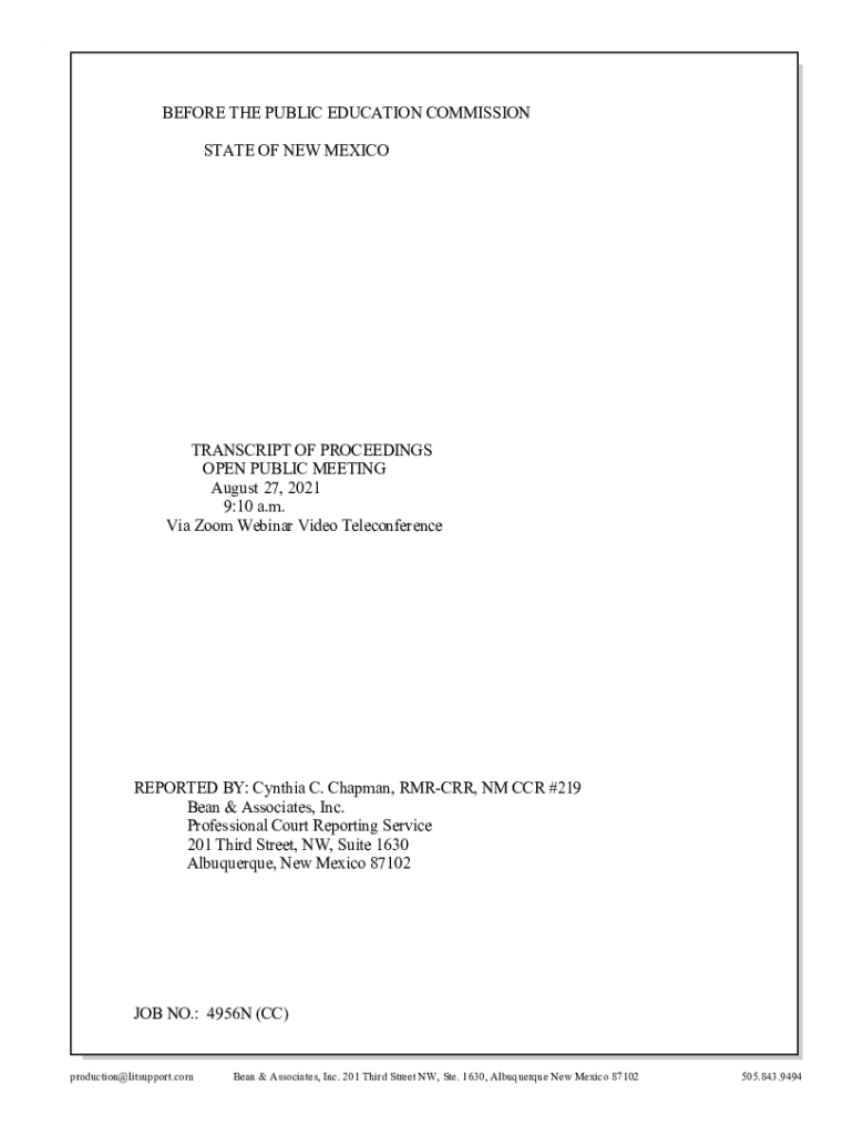 BEFORE THE PUBLIC EDUCATION COMMISSION STATE OF NEW MEXICOTRANSCRIPT OF PROCEEDINGS OPEN PUBLIC MEETING August 27, 2021 9:10 a.m. Via Zoom Webinar Video TeleconferenceREPORTED BY: Cynthia C. Chapman,