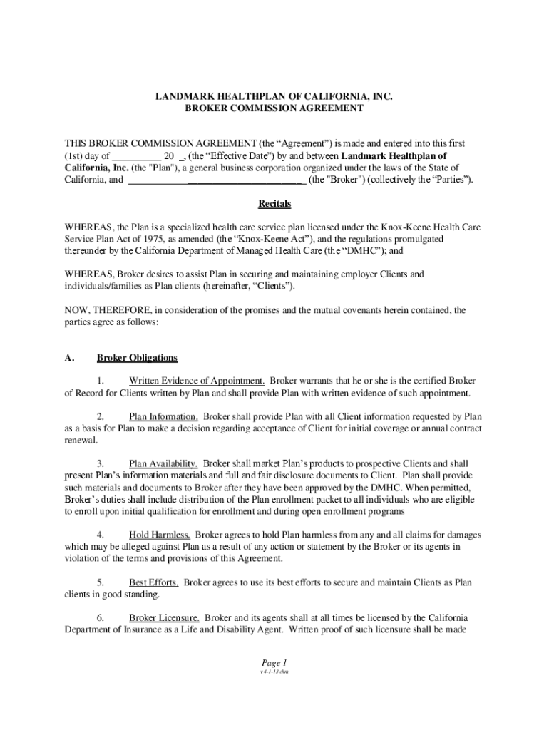 LANDMARK HEALTHILY OF CALIFORNIA, INC. BROKER COMMISSION AGREEMENT THIS BROKER COMMISSION AGREEMENT (the Agreement) is made and entered into this first (1st) day of 20, (the Effective Date) by and