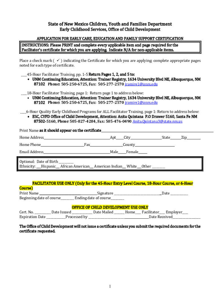 State of New Mexico Children, Youth and Families Department Early Childhood Services, Office of Child DevelopmentAPPLICATION FOR EARLY CARE, EDUCATION AND FAMILY SUPPORT CERTIFICATIONINSTRUCTIONS: