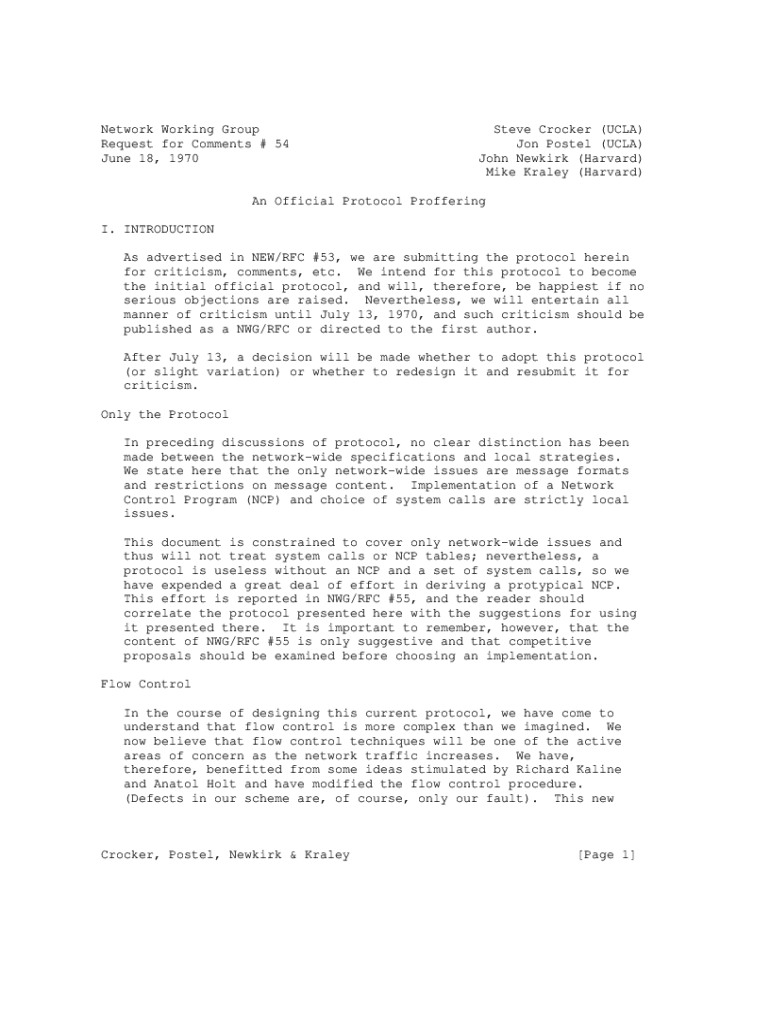 Network Working Group Request for Comments # 54 June 18, 1970Steve Crocker (UCLA) Jon Posted (UCLA) John Newark (Harvard) Mike Karla (Harvard)An Official Protocol Proffering I. INTRODUCTION As advertised