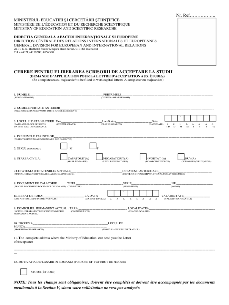 Specify the purpose or reason for filling out nr ref ministerul educatiei.