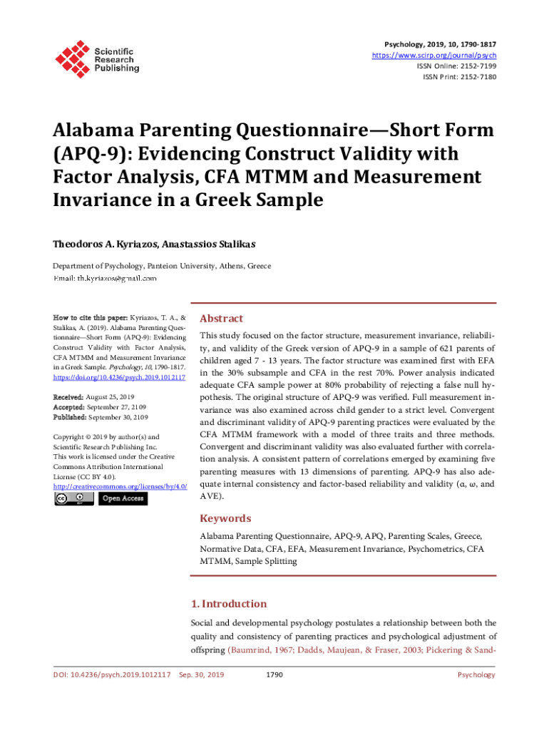Psychology, 2019, 10, 17901817 https://www.scirp.org/journal/psych ISSN Online: 21527199 ISSN Print: 21527180Alabama Parenting Questionnaire Short Form (APQ9): Evidencing Construct Validity with Factor