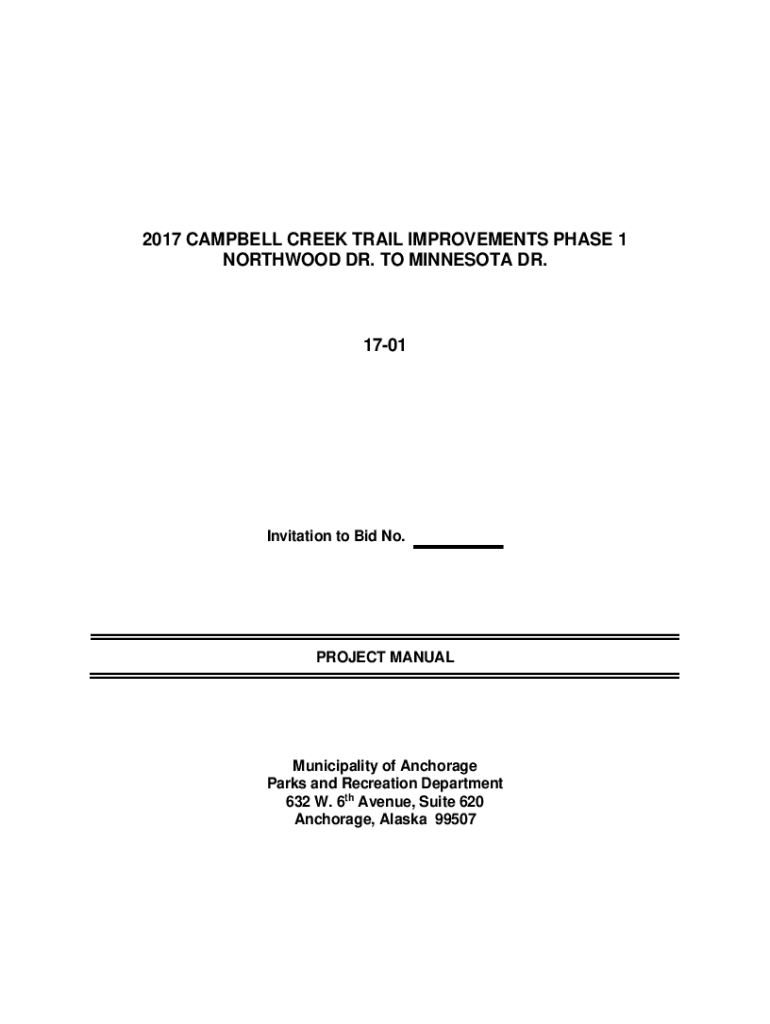 2017 CAMPBELL CREEK TRAIL IMPROVEMENTS PHASE 1 NORTHWARD DR. TO MINNESOTA DR.1701Invitation to Bid No. PROJECT MANUALMunicipality of Anchorage Parks and Recreation Department 632 W. 6th Avenue, Suite