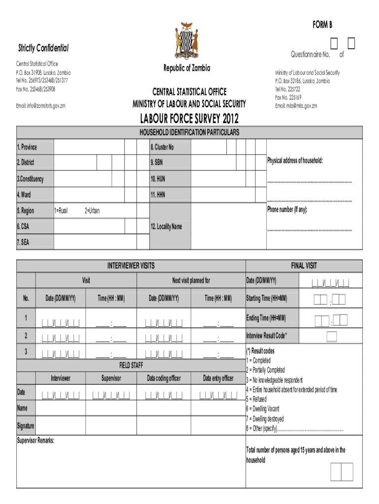 FORM B Strictly ConfidentialQuestionnaire No. Central Statistical Office P.O. Box 31908, Lusaka, Zambia Tel No. 256973/253468/251377 Fax No. 253468/253908Republic of ZambiaCENTRAL STATISTICAL OFFICE