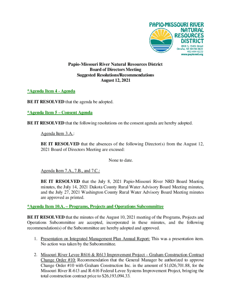 PapioMissouri River Natural Resources District Board of Directors Meeting Suggested Resolutions/Recommendations August 12, 2021 *Agenda Item 4 Agenda BE IT RESOLVED that the agenda be adopted. *Agenda