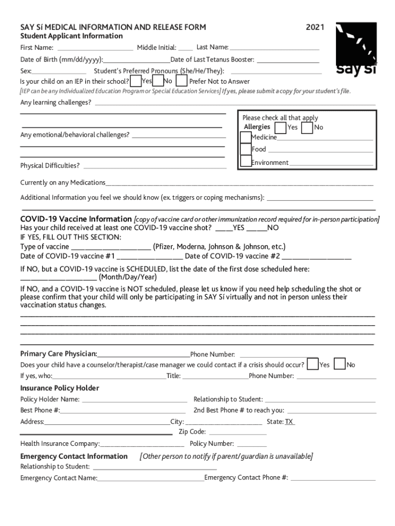 SAY S MEDICAL INFORMATION AND RELEASE FORM2021Student Applicant Information First Name:Middle Initial:Last Name:Date of Birth (mm/dd/YYY): Date of Last Tetanus Booster: Sex: Students Preferred Pronouns