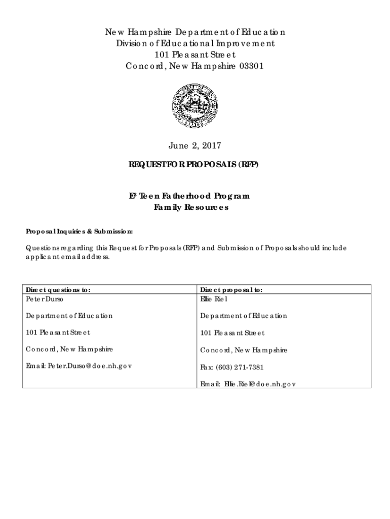New Hampshire Department of Education Division of Educational Improvement 101 Pleasant Street Concord, New Hampshire 03301June 2, 2017 REQUEST FOR PROPOSALS (RFP) E Teen Fatherhood Program Family