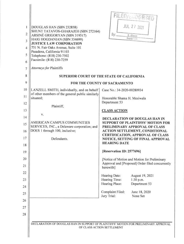 FDP;ff I 2 J 4 56 7DOUGLAS HAN (SON 2328s8) SHE|NT TATAVOSGHARAJEH (SON ARSON GREGORIAN (SON 3t9sr7) Hard JORDANIAN (SON 334699) JUSTICE LAW CORPORATION 751 N. Fair Oaks Avenue, Suite l0l Pasadena,