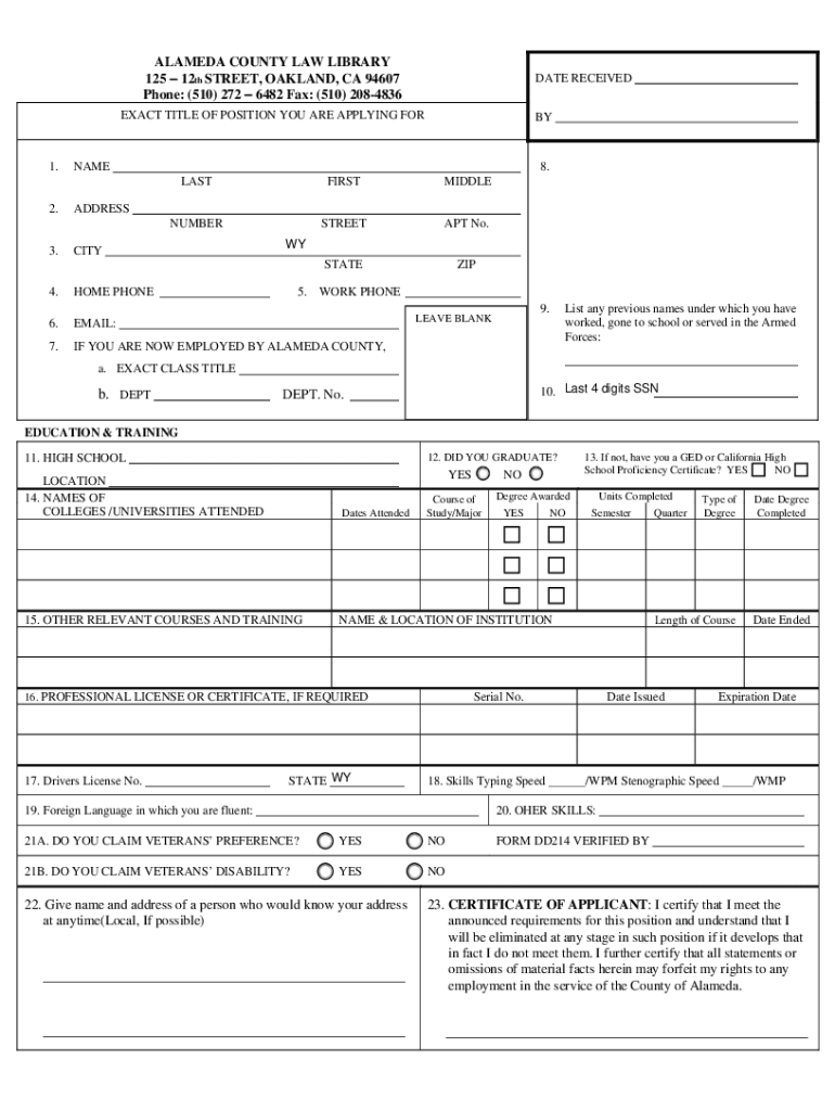 ALAMEDA COUNTY LAW LIBRARY 125 12th STREET, OAKLAND, CA 94607 Phone: (510) 272 6482 Fax: (510) 2084836DATE RECEIVEDEXACT TITLE OF POSITION YOU ARE APPLYING FOR1. 2. 3.BYNAME8. LASTFIRSTMIDDLENUMBERSTREETAPT