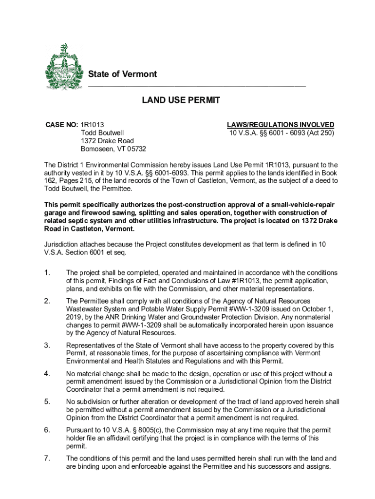 State of Vermont LAND USE PERMIT CASE NO: 1R1013 Todd Bout well 1372 Drake Road Boosted, VT 05732LAWS/REGULATIONS INVOLVED 10 V.S.A. 6001 6093 (Act 250)The District 1 Environmental Commission hereby