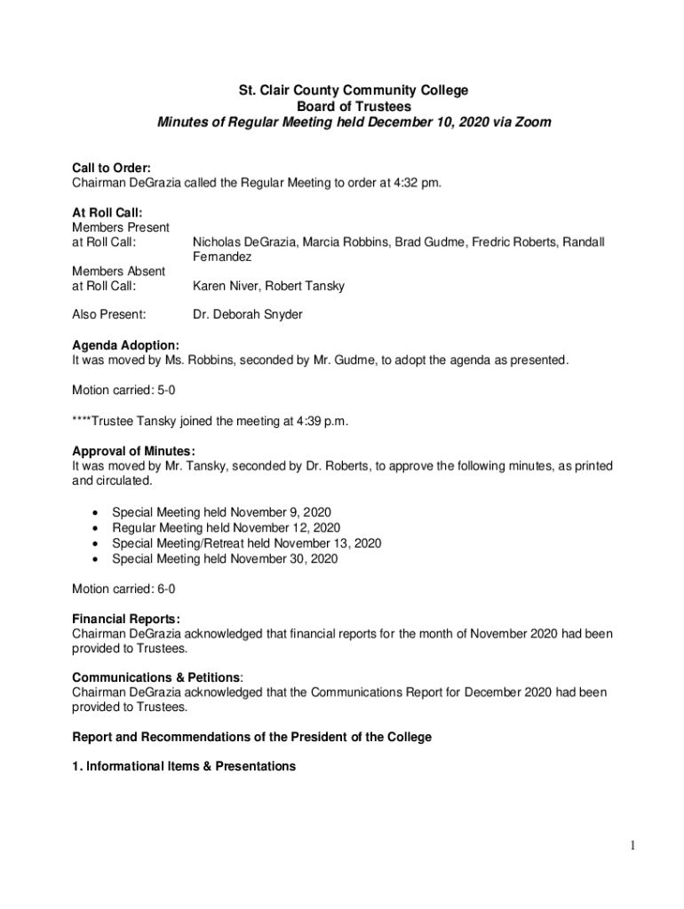 St. Clair County Community College Board of Trustees Minutes of Regular Meeting held December 10, 2020, via Zoom Call to Order: Chairman Degraded called the Regular Meeting to order at 4:32 pm. At
