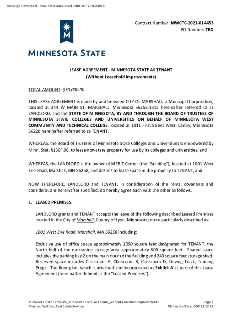 DocuSign Envelope ID: 246E57D843D24C0184BE97F731CA39EDContract Number: MWCTC2021014453 PO Number: RELEASE AGREEMENT MINNESOTA STATE AS TENANT (Without Leasehold Improvements) TOTAL AMOUNT: $50,000.00