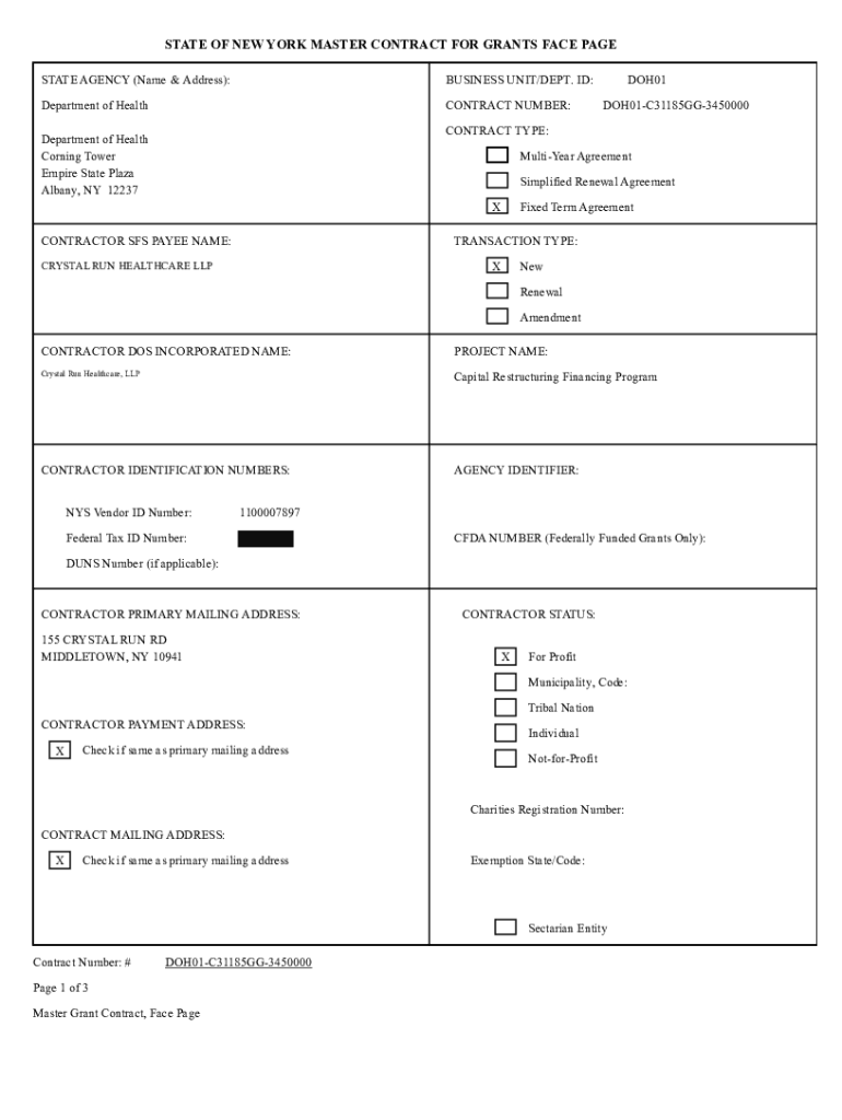 Get the free State of New York Master Contract for Grants Face Page #DOH01-C31185GG-3450000. Cont...