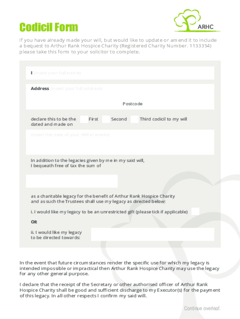 Codicil Form If you have already made your will, but would like to update or amend it to include a bequest to Arthur Rank Hospice Charity (Registered Charity Number. 1133354) please take this form