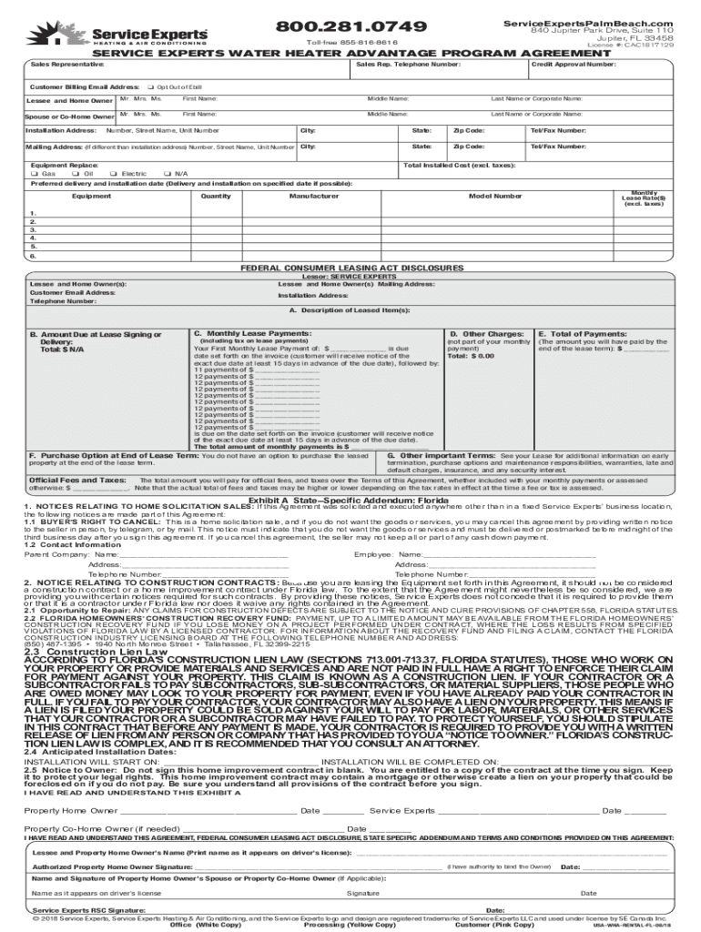 800.281.0749ServiceExpertsPalmBeach.com 840 Jupiter Park Drive, Suite 110 Jupiter, FL 33458Tollfree 8558168616License #: CAC1817129SERVICE EXPERTS WATER HEATER ADVANTAGE PROGRAM AGREEMENT Sales Representative:Sales
