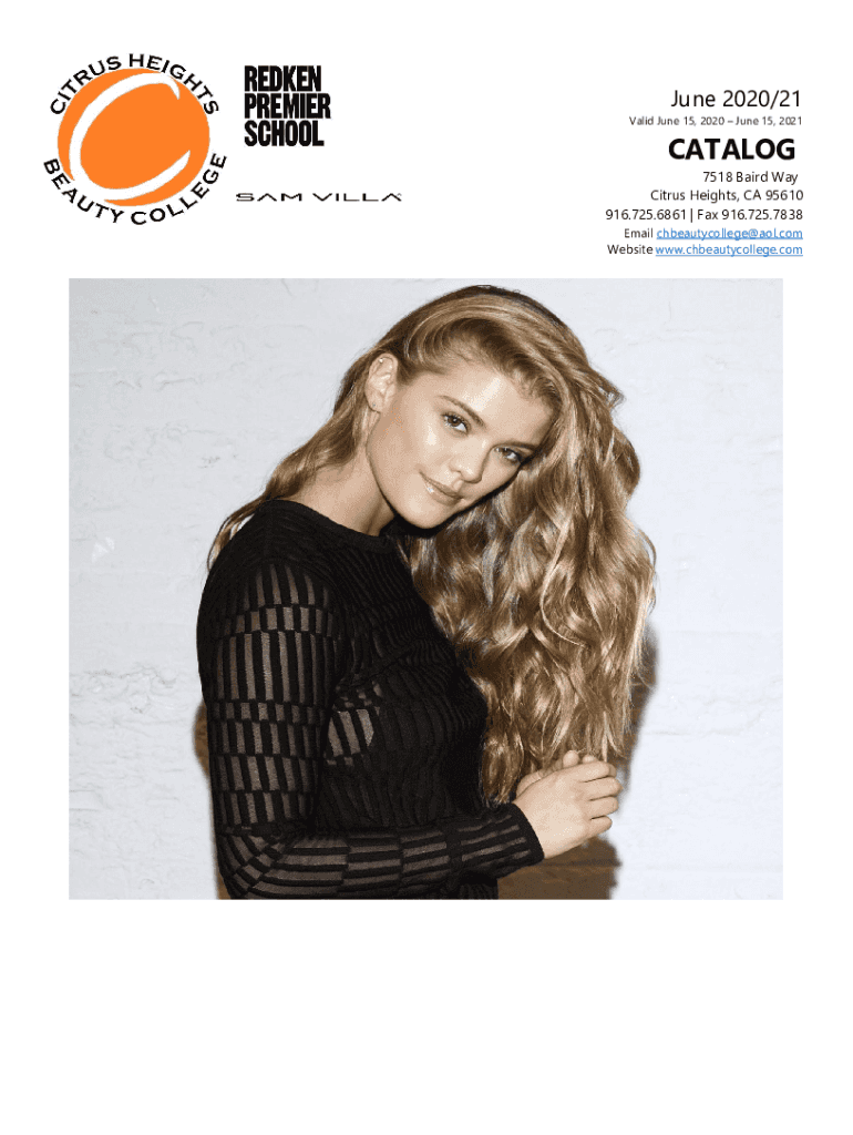 June 2020/21 Valid June 15, 2020, June 15, 2021CATALOG 7518 Baird Way Citrus Heights, CA 95610 916.725.6861 Fax 916.725.7838 Email chbeautycollege aol.com Website www.chbeautycollege.comCITRUS HEIGHTS