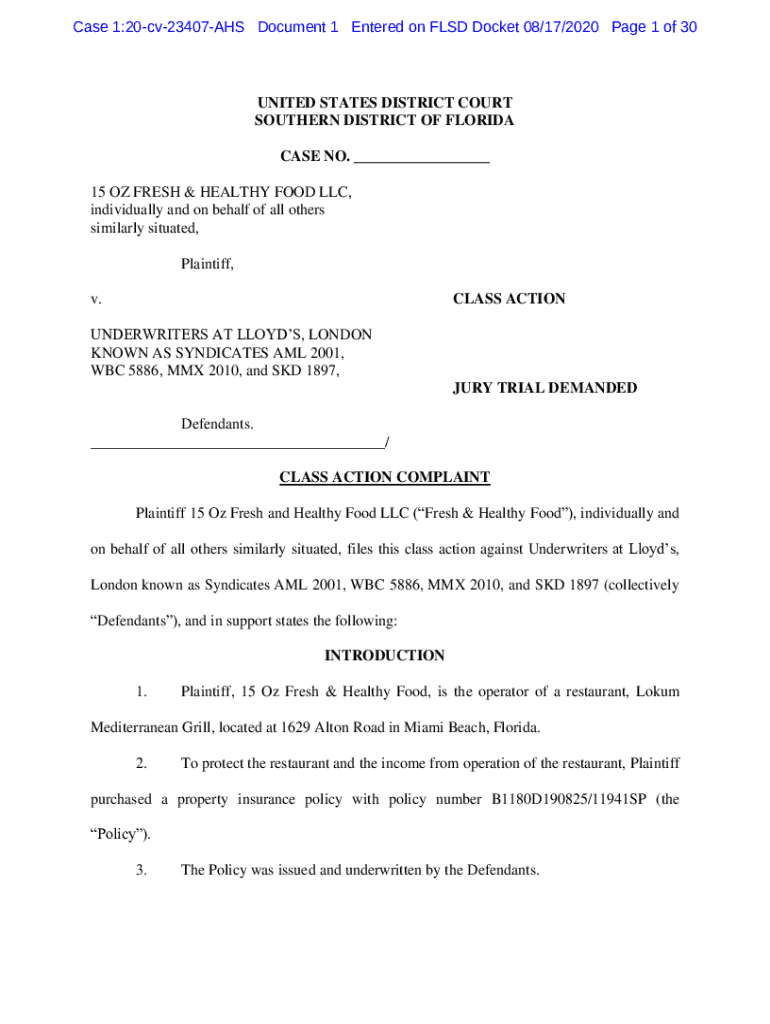 Case 1:20cv23407AHS Document 1 Entered on FLED Docket 08/17/2020-Page 1 of 30UNITED STATES DISTRICT COURT SOUTHERN DISTRICT OF FLORIDA CASE NO. 15 OZ FRESH & HEALTHY FOOD LLC, individually and on