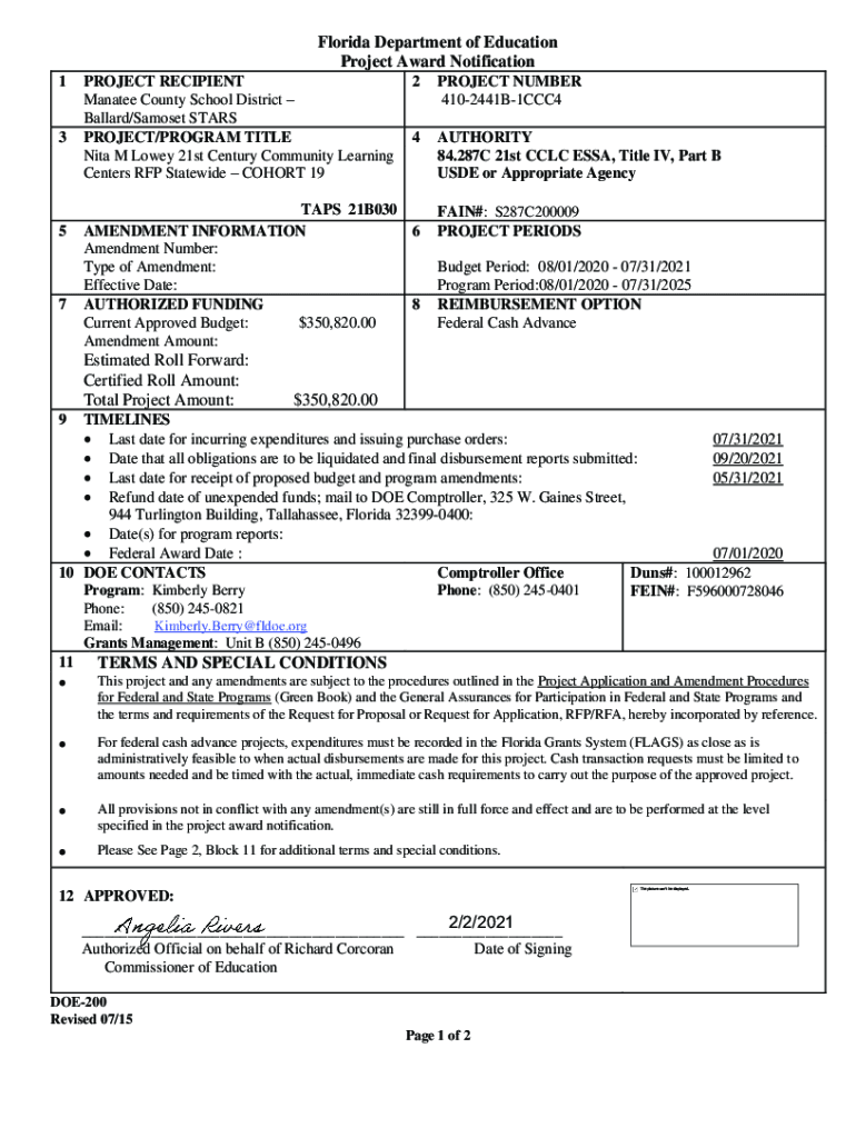 Florida Department of Education Project Award Notification 1357PROJECT RECIPIENT Manatee County School District Ballard/Samoset STARS PROJECT/PROGRAM TITLE Nita M Lower 21st Century Community Learning