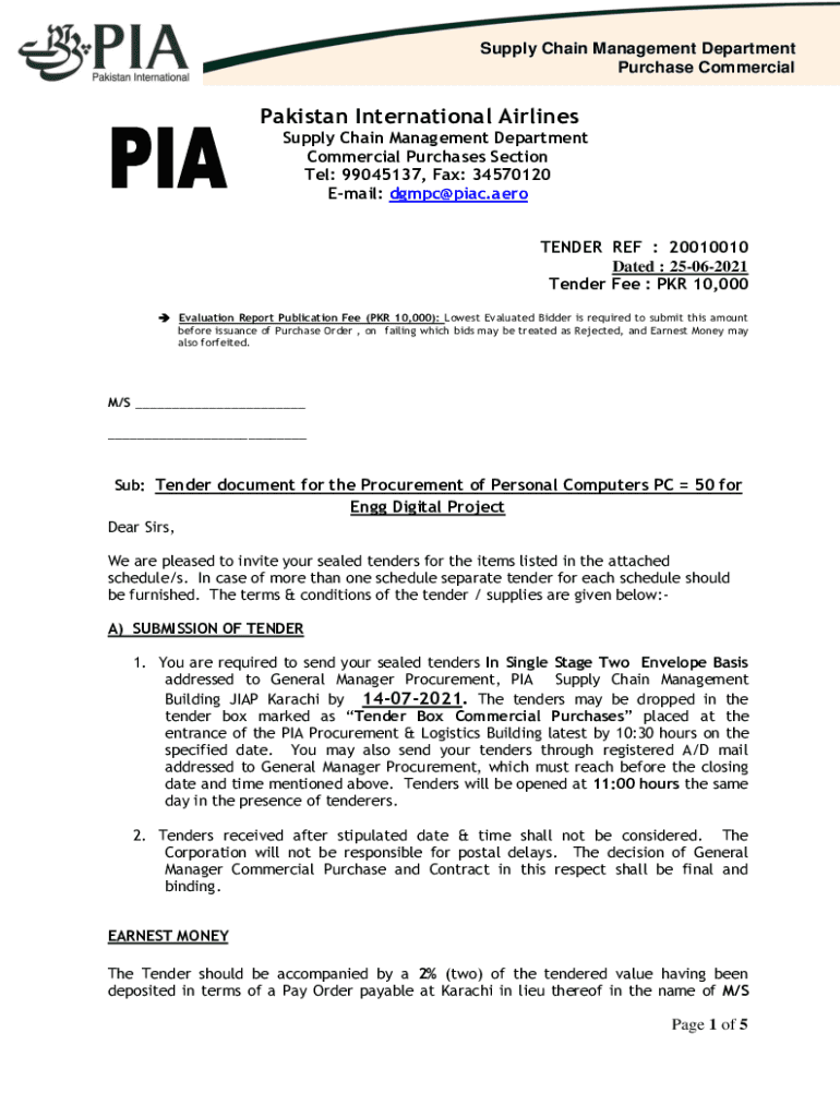 Supply Chain Management Department Purchase Commercial Pakistan International Airlines Supply Chain Management Department Commercial Purchases Section Tel: 99045137, Fax: 34570120 Email: dgmpc@piac.aero