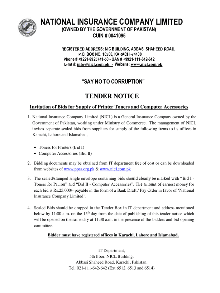 NATIONAL INSURANCE COMPANY LIMITED (OWNED BY THE GOVERNMENT OF PAKISTAN)COIN # 0041095 REGISTERED ADDRESS: NIC BUILDING, ABBAS SHAHEED ROAD, P.O. BOX NO. 10506, KARACHI74400 Phone # +9221992574150