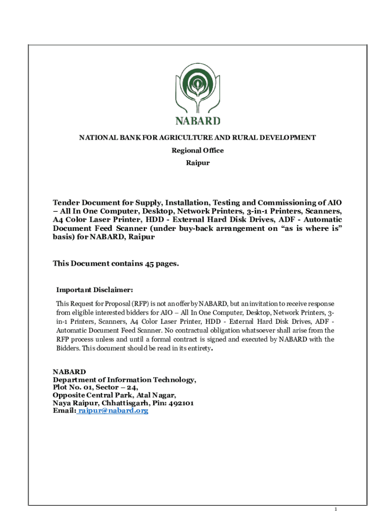 NATIONAL BANK FOR AGRICULTURE AND RURAL DEVELOPMENT Regional Office RaipurTender Document for Supply, Installation, Testing and Commissioning of AIO All In One Computer, Desktop, Network Printers,