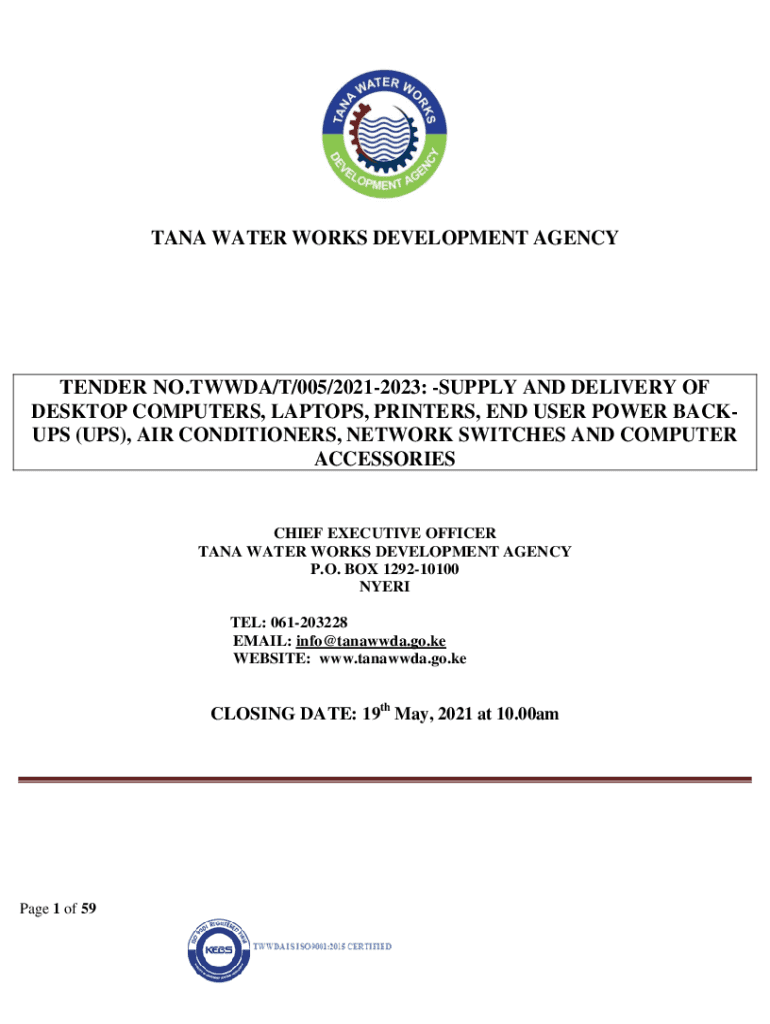 TANK WATER WORKS DEVELOPMENT AGENCYTENDER NO.TWWDA/T/005/20212023: SUPPLY AND DELIVERY OF DESKTOP COMPUTERS, LAPTOPS, PRINTERS, END USER POWER BACKUPS (UPS), AIR CONDITIONERS, NETWORK SWITCHES AND