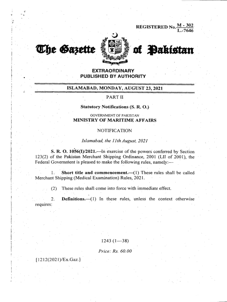 C 'REGISTERED No. M 302 L.7646 ; IOF(EXTRAORDINARY PUBLISHED BY AUTHORITY) 5 ISLAMABAD, MONDAY, AUGUST 23, 2021! Part III Statutory Notifications (S. R. O.)) GOVERNMENT OF PAKISTANMINISTRY OF MARITIME