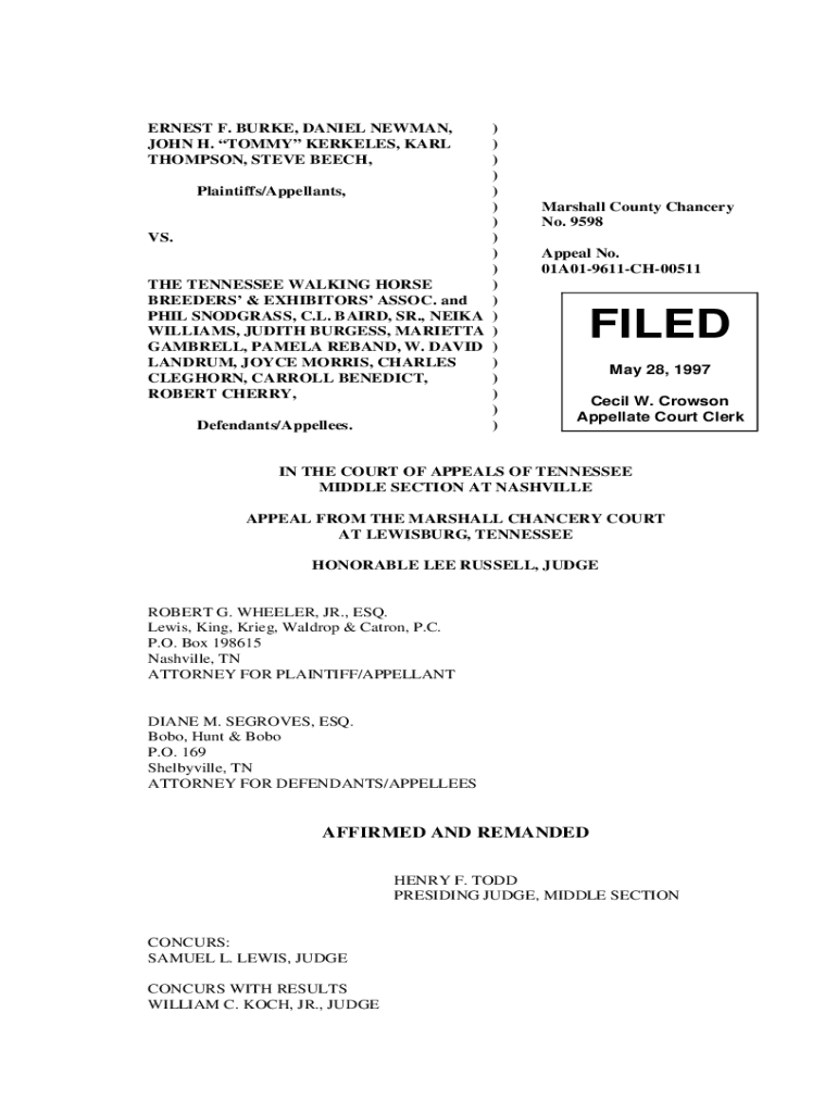 ERNEST F. BURKE, DANIEL NEWMAN, JOHN H. TOMMY BERKELEY, KARL THOMPSON, STEVE BEECH, ) ))) Plaintiffs/Appellants,) )) VS. ))) THE TENNESSEE WALKING HORSE) BREEDERS & EXHIBITORS ASSOC. And) PHIL SNODGRASS,