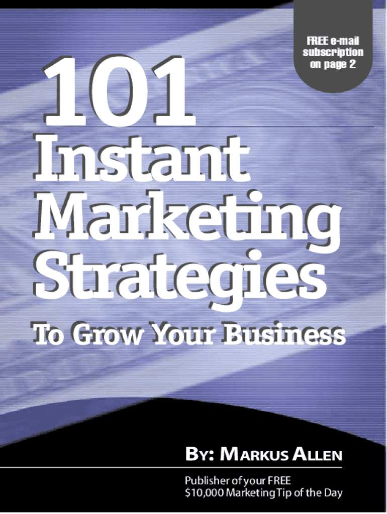 1101FREE email subscription on page 2Instant Marketing Strategies To Grow Your Business: MARKUS ALLEN 101 Instant Marketing Strategies Publisher of your FREE To Grow Your Business$10,000 Marketing