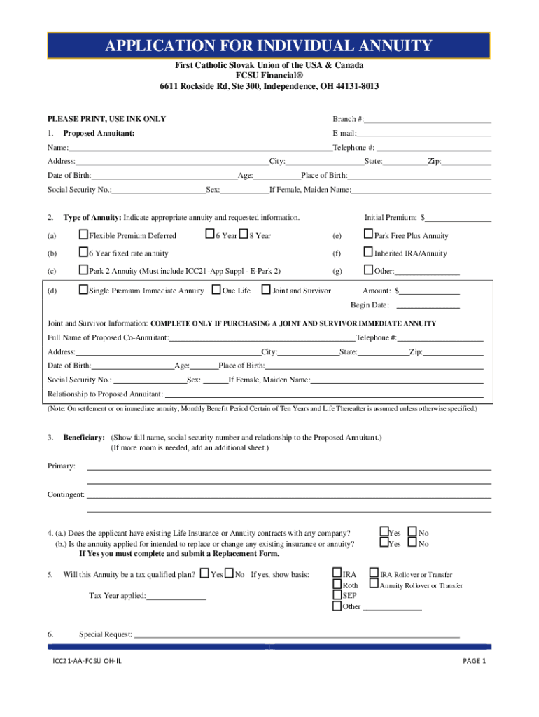 APPLICATION FOR INDIVIDUAL ANNUITY First Catholic Slovak Union of the USA & Canada CSU Financial 6611 Dockside Rd, Ste 300, Independence, OH 441318013PLEASE PRINT, USE INK ONLY Branch #:1. Email:Proposed