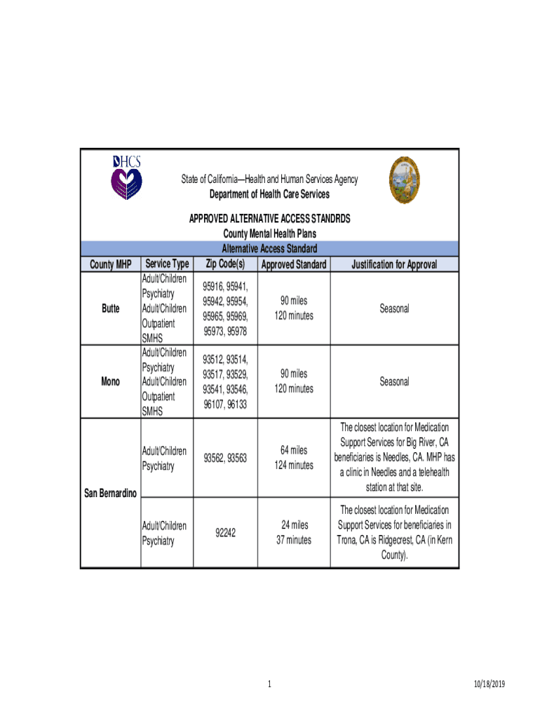 State of CaliforniaHealth and Human Services Agency Department of Health Care Services APPROVED ALTERNATIVE ACCESS STANDARDS County Mental Health Plans Alternative Access Standard County MHP Service
