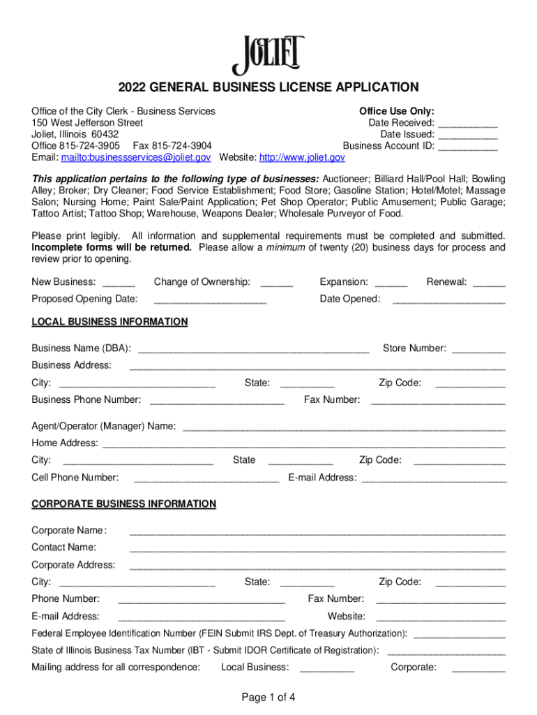 2022 GENERAL BUSINESS LICENSE APPLICATION Office of the City Clerk Business Services Office Use Only: 150 West Jefferson Street Date Received: Joliet, Illinois 60432 Date Issued: Office 8157243905