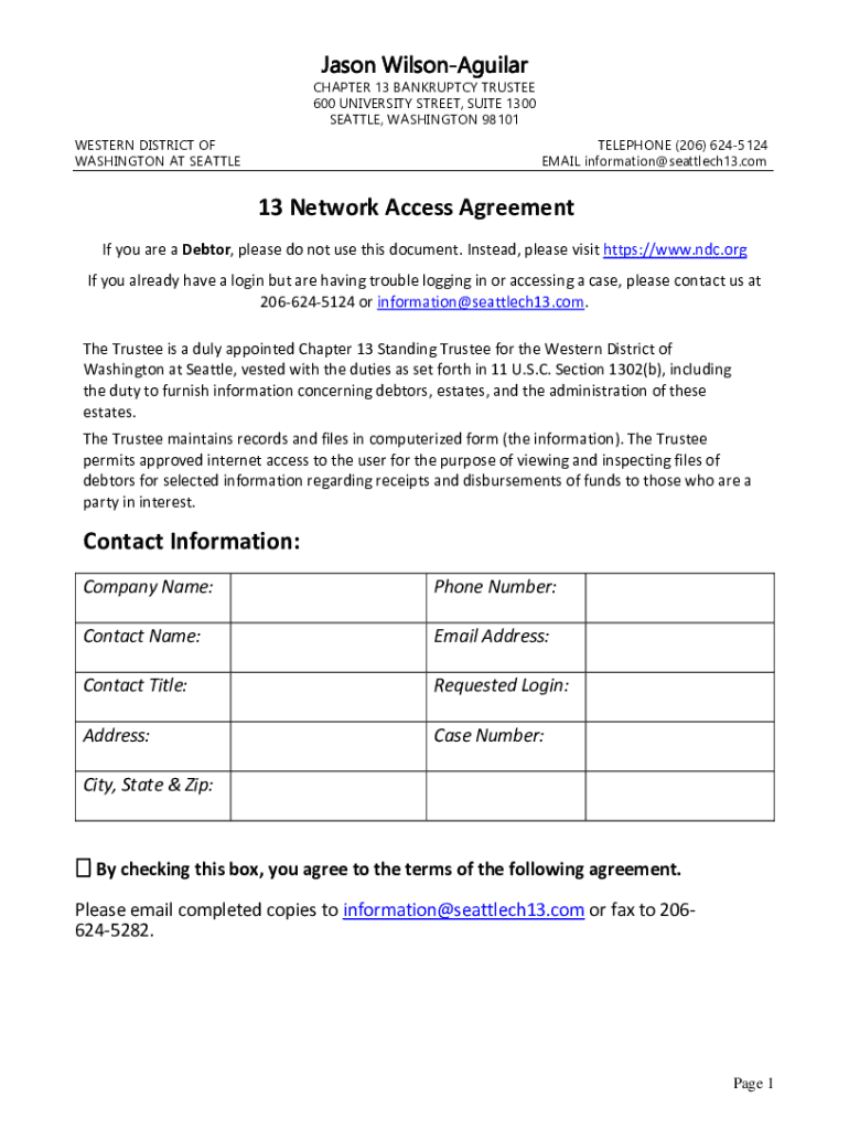Jason Wilson Aguilar CHAPTER 13 BANKRUPTCY TRUSTEE 600 UNIVERSITY STREET, SUITE 1300 SEATTLE, WASHINGTON 98101 WESTERN DISTRICT OF WASHINGTON AT SEATTLETELEPHONE (206) 6245124 EMAIL information@seattlech13.com13