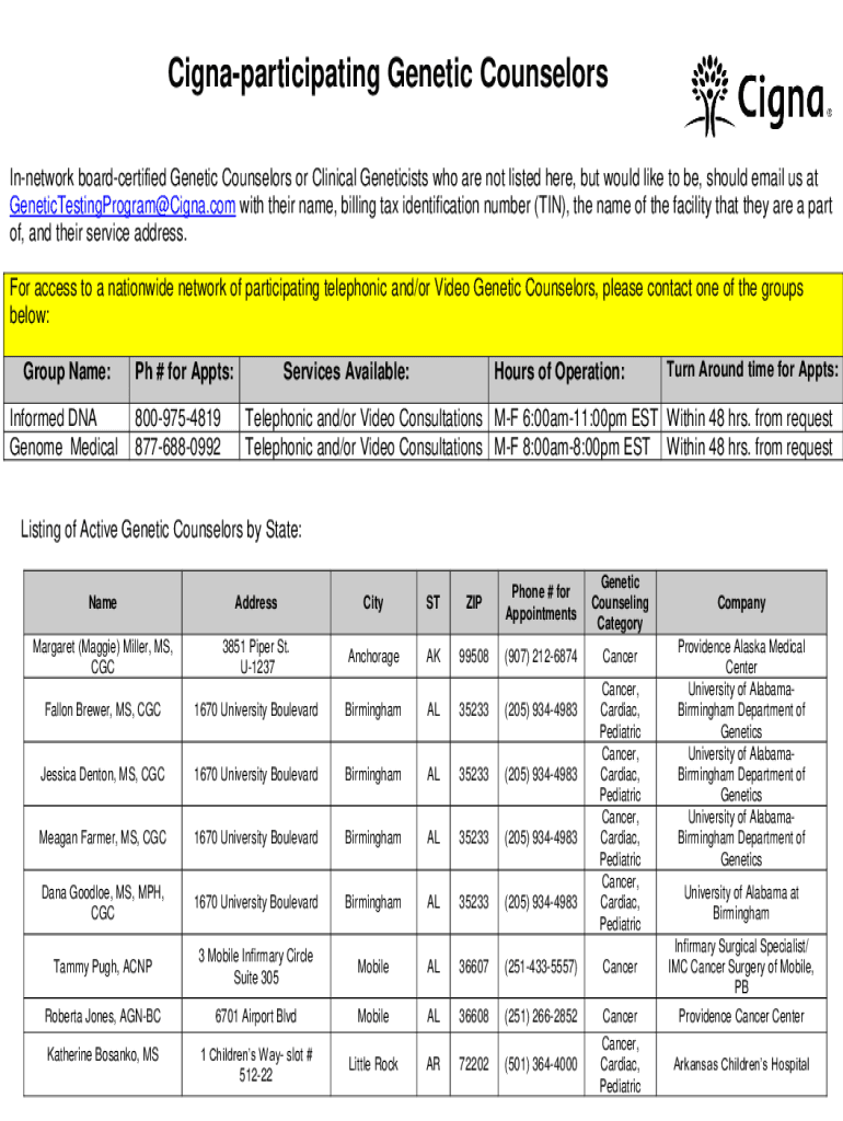 Cignaparticipating Genetic Counselors In network board certified Genetic Counselors or Clinical Geneticists who are not listed here, but would like to be, should email us at GeneticTestingProgram@Cigna.com
