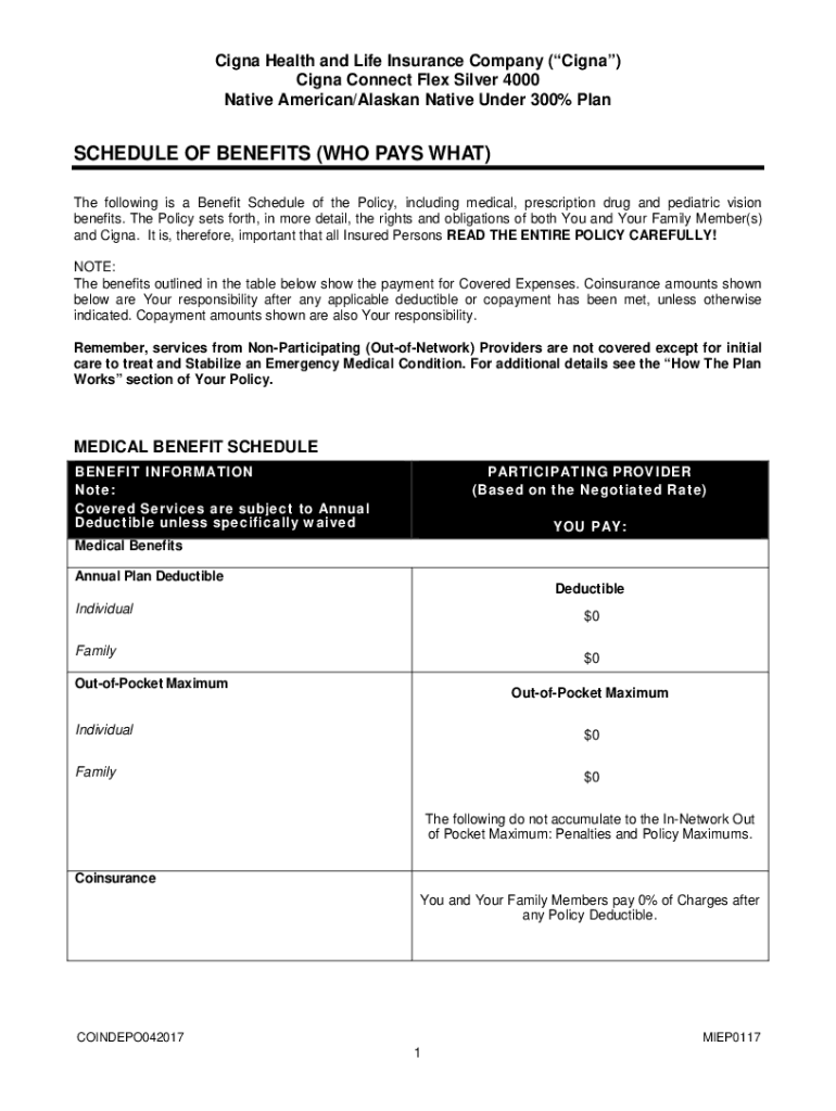 Cagney Health and Life Insurance Company (Cagney) Cagney Connect Flex Silver 4000 Native American/Alaskan Native Under 300% Pre-schedule OF BENEFITS (WHO PAYS WHAT) The following is a Benefit Schedule