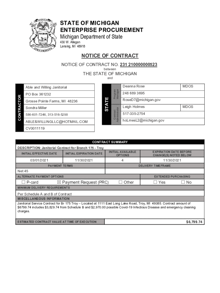 STATE OF MICHIGAN ENTERPRISE PROCUREMENT Michigan Department of State 430 W. Alleged Lansing, MI 48918NOTICE OF CONTRACT NOTICE OF CONTRACT NO. 231 210000000523. Between STATE OF MICHIGAN engrossed