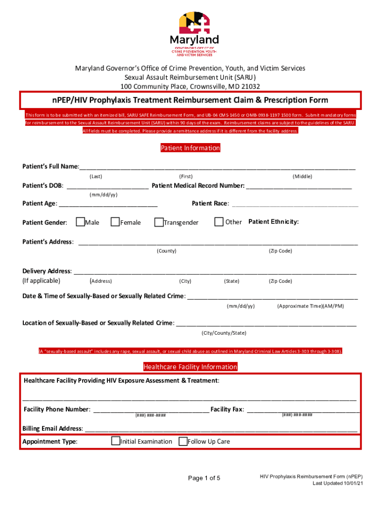 Maryland Governors Office of Crime Prevention, Youth, and Victim Services Sexual Assault Reimbursement Unit (SARA) 100 Community Place, Brownsville, MD 21032nPEP/HIV Prophylaxis Treatment Reimbursement