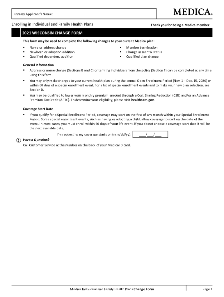 Primary Applicants Name:Enrolling in Individual and Family Health PlansThank you for being a Media member!2021 WISCONSIN CHANGE From This form may be used to complete the following changes to your
