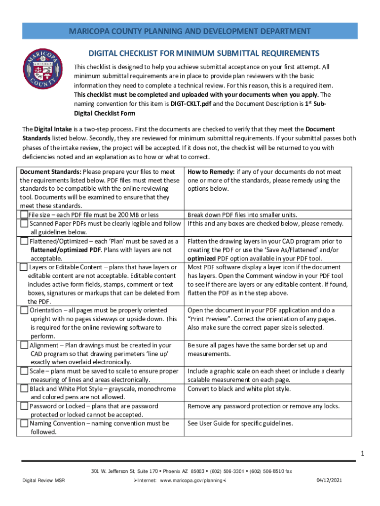 MARICOPA COUNTY PLANNING AND DEVELOPMENT DEPARTMENT DIGITAL CHECKLIST FOR MINIMUM SUBMITTAL REQUIREMENTS This checklist is designed to help you achieve submittal acceptance on your first attempt.