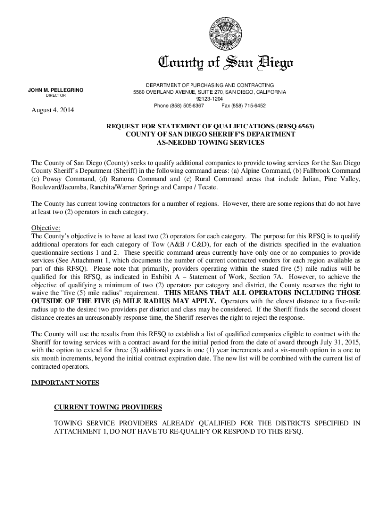 JOHN M. PELLEGRINO1.1. DIRECTOR August 4, 2014DEPARTMENT OF PURCHASING AND CONTRACTING 5560 OVERLAND AVENUE, SUITE 270, SAN DIEGO, CALIFORNIA 921231204 Phone (858) 5056367 Fax (858) 7156452REQUEST